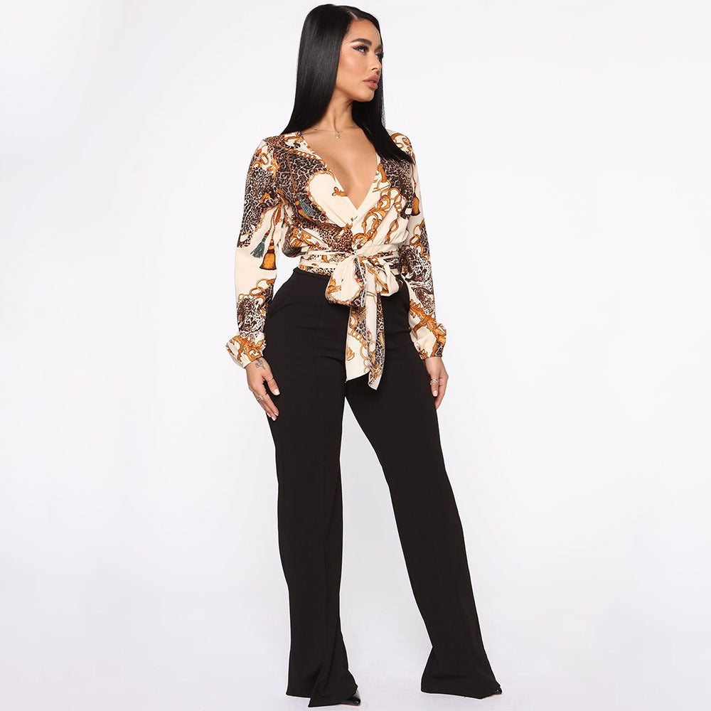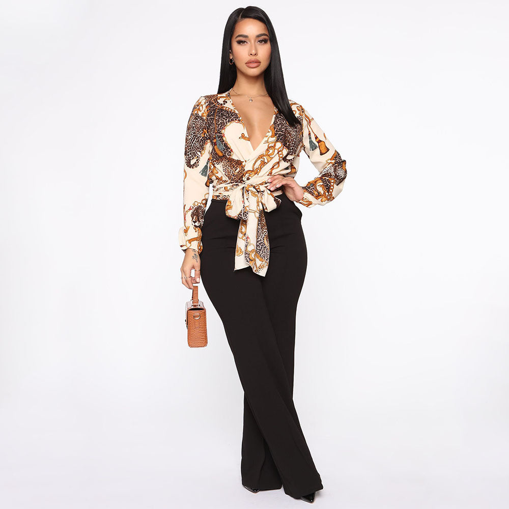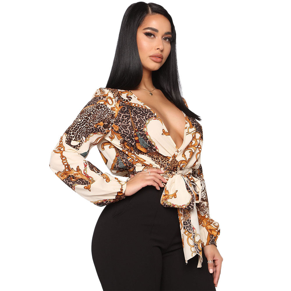 OS6282 Cross-border Autumn New European And American Women's Fashion Sexy V-neck Bow Strap Long Sleeve Short Top